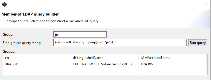 Entering (a part of) the name of the Directory group and then hitting "Run query" will present the available groups matching the name: