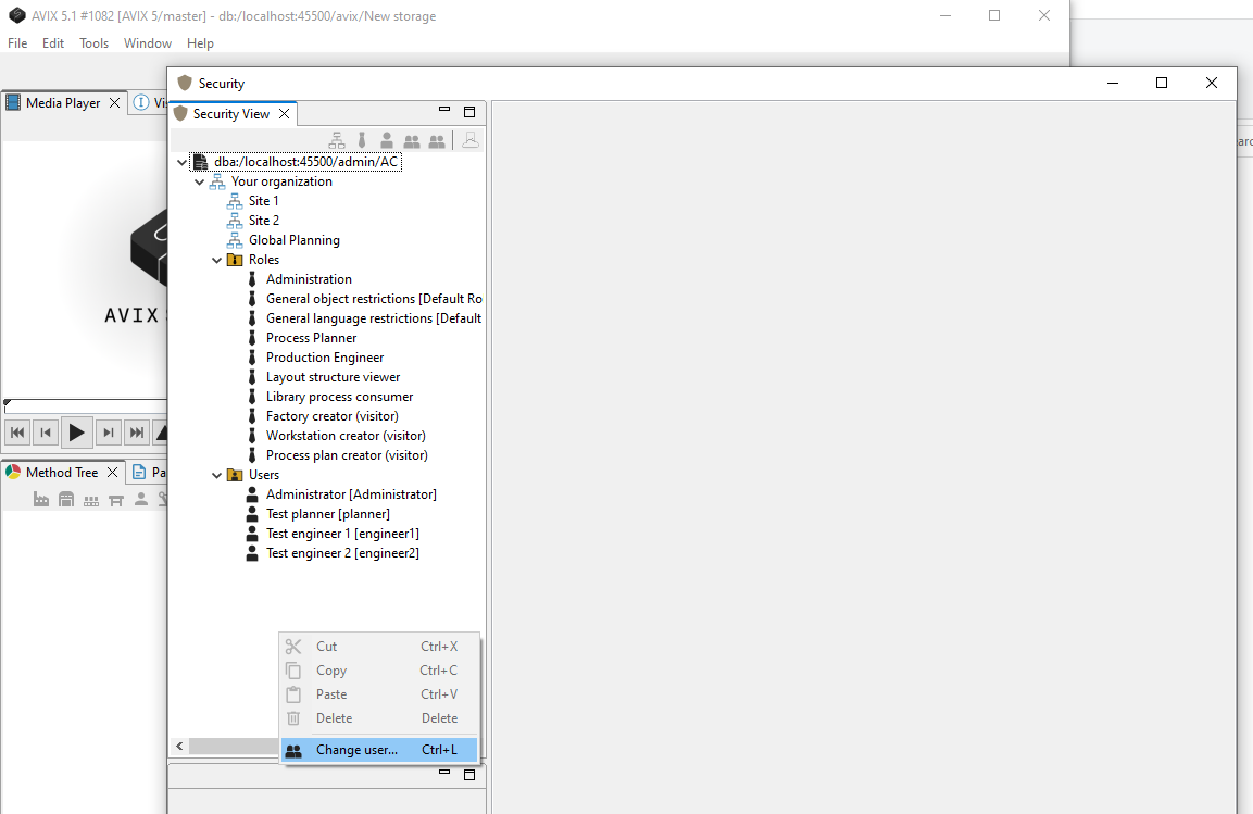 Start the AVIX application, and open an already existing db storage that makes use of the "AC" db storage for access control. If you followed the previous steps, the "New storage" is fine, since it was connected to the "AC" db storage. ( Creating a new db storage, and make it refer the "AC" db storage is also fine).