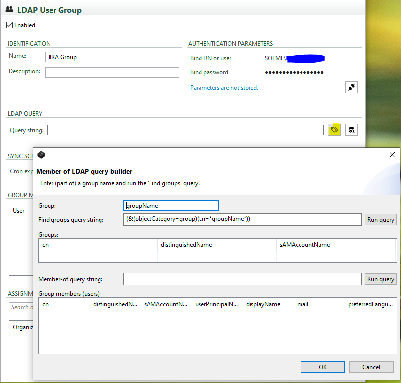The "LDAP Query" scheduling section is about entering the query string that will eventually be used to get the members from the correct group in the Directory Service. As a convenience, a query builder UI dialog is available (the little button adjacent to the text field).