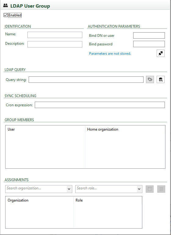 The "Authentication Parameters" contains fields that you may fill in to be able to try out communication with the Directory Service. As stated, these parameters are not stored and you need to re-enter them if you close the editor.