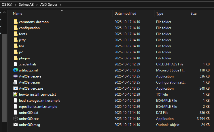 Run the installer "AVIX v5.1.XX (64-bit).exe" to install the AVIX server. By default it is installed in the folder "C:\Solme AB\AVIX Server" and should look similar to this (content may vary a bit).