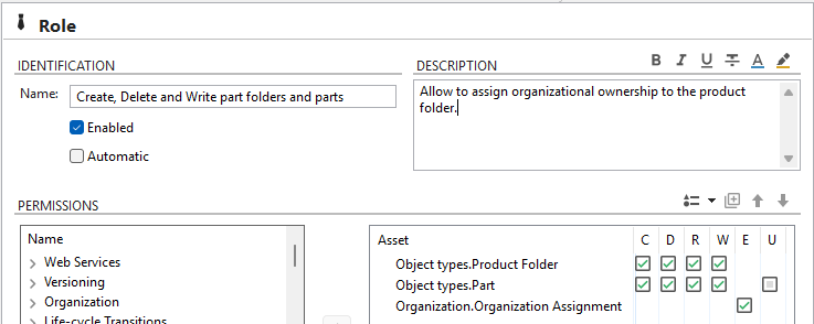 STEP 2: Design a role that allow creation and editing of folder and part. As well as assigning organizational ownership.ownership to the product folder.