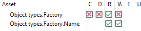 The first asset of the role entitles a user to read (see) the factory object, i.e. it can be opened in an editor and all attributes will be shown. But, since the write permission is not checked, all attributes will be read-only.