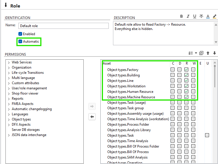 Note! BelowSettings settingsbelow expect an automatic role (or similar) that allow Read from Factory -> Resource.