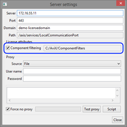 The current component filtering setting is also visible in the floating license settings dialog. In the example below component filtering is enabled and the filter file folder is set to “C:/AVIX/ComponentFilters”.
