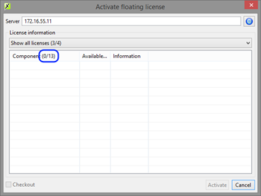Can be caused by component filtering being active and no filter files available in the specified folder. It is pretty easy to spot if this is the problem in the floating license dialog. In the highlighted suffix of the component column title the number of visible components and the total number components are shown if the component list is filtered. In this example 0 of 13 is shown, hence the empty list.