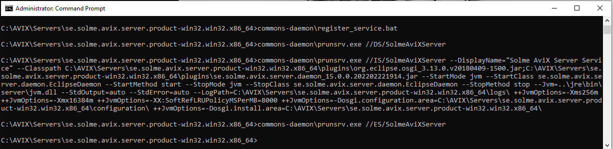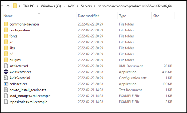 - Assert you are in the root directory of the AVIX server. Using the example screenshot from the "Unzip" section above, the "C:\AVIX\Servers\se.solme.avix.server.product-win32.win32.x86_64" directory.