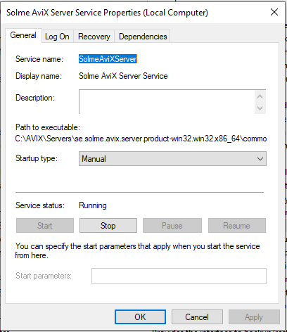 Before the next step, installing the service, it is recommended to stop the "Solme AviX Server Service" in the Windows Services manager.