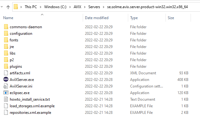Download the installation media, the server zip archive. If you don´t have a download URL, ask your contact at Solme AB to get one. The downloadable unit is entitled "se.solme.avix.server.product-win32.win32.x86_64.zip" or similarly.