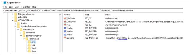 The easiest way to affect the correct registry value is by running the ”service manager” executable. It is found here: commons-daemon\SolmeAviXServer.exe. Run it, and look on the Java tab: