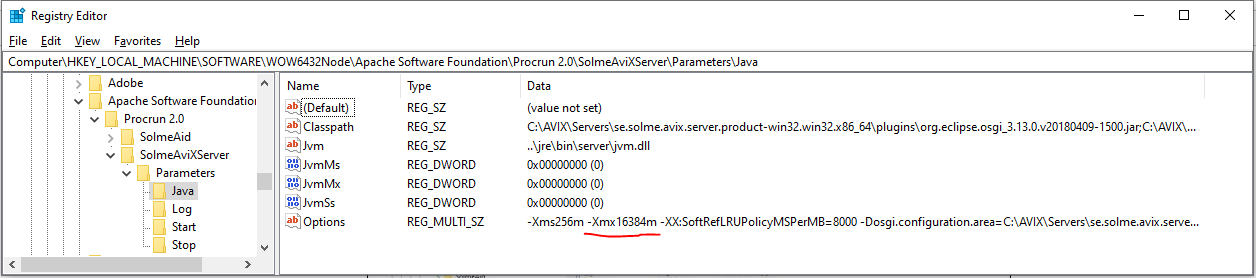 It is also possible to achive this by changing in the registry directly. The node is found in the Windows Registry Editor under: Computer\HKEY_LOCAL_MACHINE\SOFTWARE\WOW6432Node\Apache Software Foundation\Procrun 2.0\SolmeAviXServer\Parameters\Java