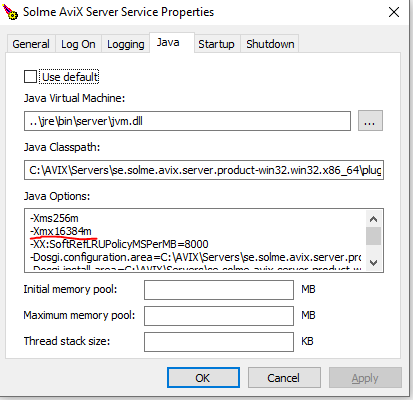 An easy way to change the JVM settings is to run the ”service manager” executable. It is found here:  commons-daemon\SolmeAviXServer.exe. Run it, and look on the Java tab: