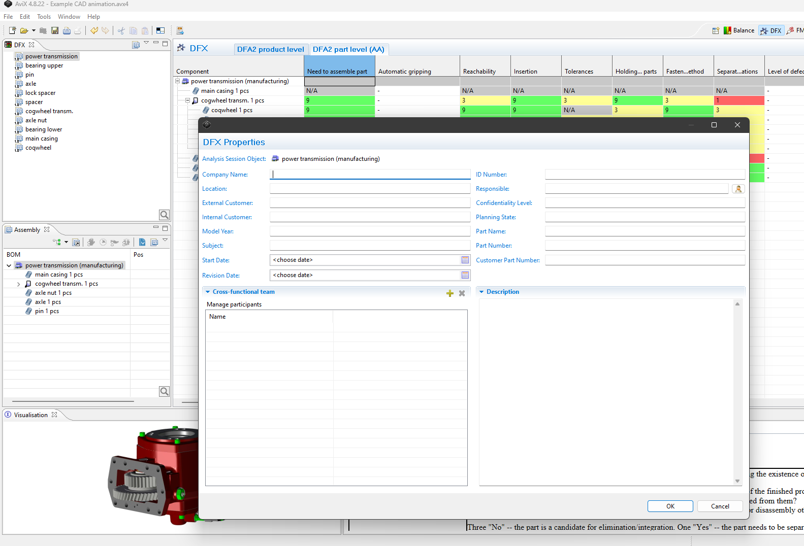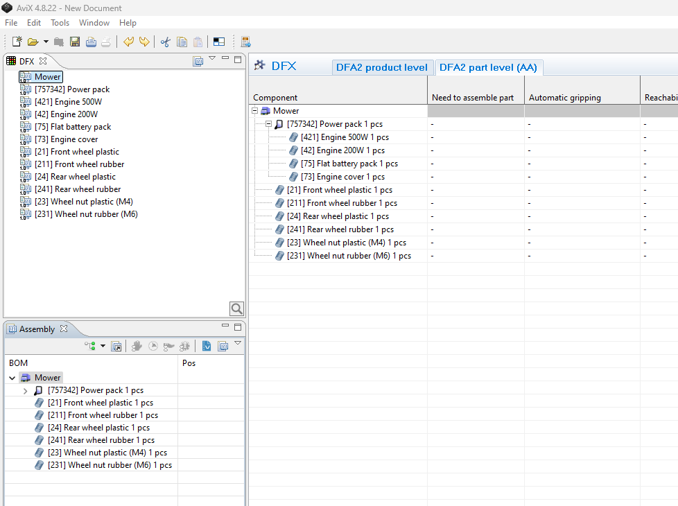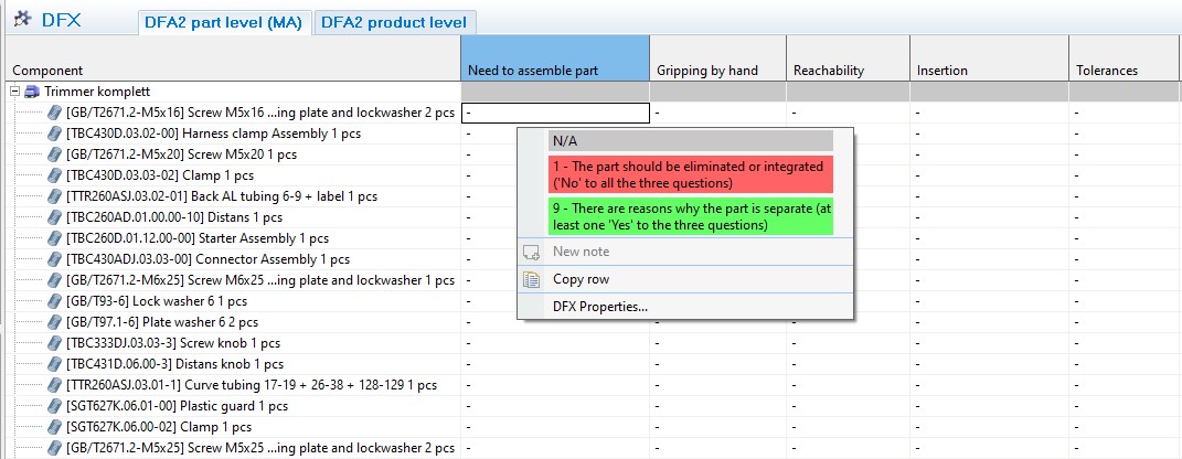 - Select the product structure in the assembly view and the DFX table/matrix will be available. You can now choose between the DFX at part-level or product-level. (the aspects can be changed in the settings)