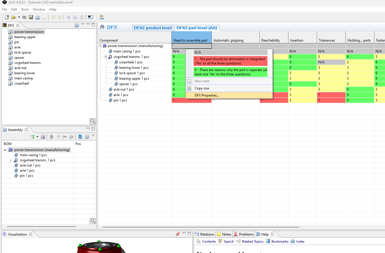 - The DFX analysis can now be performed by selecting the desired DFX aspect, and then right-click to evaluate the part