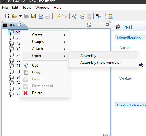 - Select the desired top part in the parts list and right-click "open in assembly view". The MBOM will now show in the assembly view.