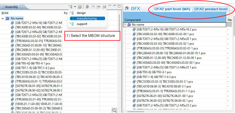 To start working with the DFX analysis is straight forward – Select the desired M-BOM structure and the DFX palette will be available. You can now choose between the DFX at part-level or product-level.