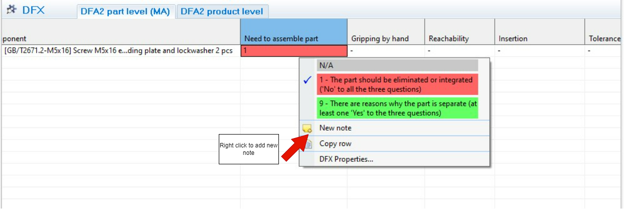 Note/action follow-up information: It is of significance for the follow-up work that the discussions and comments that typically arise during an “analysis session” are captured. This is, of course, even more important in the case of a problem: when the score of 1 is set for a Component, it is advisory to document the cause and what actions are to be taken. All this can be achieved by adding a “Note” (from the right-click menu in the grid), and entering the relevant information.