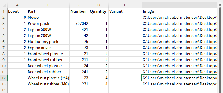 Once we have imported the parts, select the top part and right-click "show in assembly", and the MBOM looks like below. Note that based on the “level” attribute in the Excel sheet we get the correct structure of the different sub-assemblies.