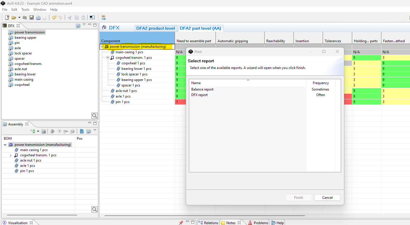 The DFX report, is printed by: Selecting the top assembly level in the DFX grid --> Print button