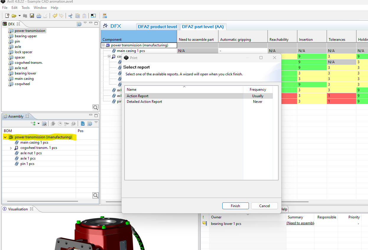 The Action report, is printed by: Selecting the top assembly level in the Assembly view --> Print button