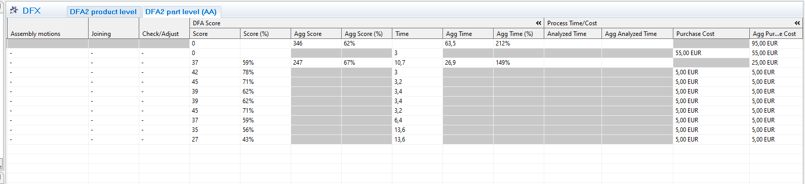 - Agg Time (%): Time divided by total optimal theoretical time .How many times longer is required to perform the assembly compared to optimal DFAA index. (E.g. 500% means 5 times longer than optimal according to DFAA standard)