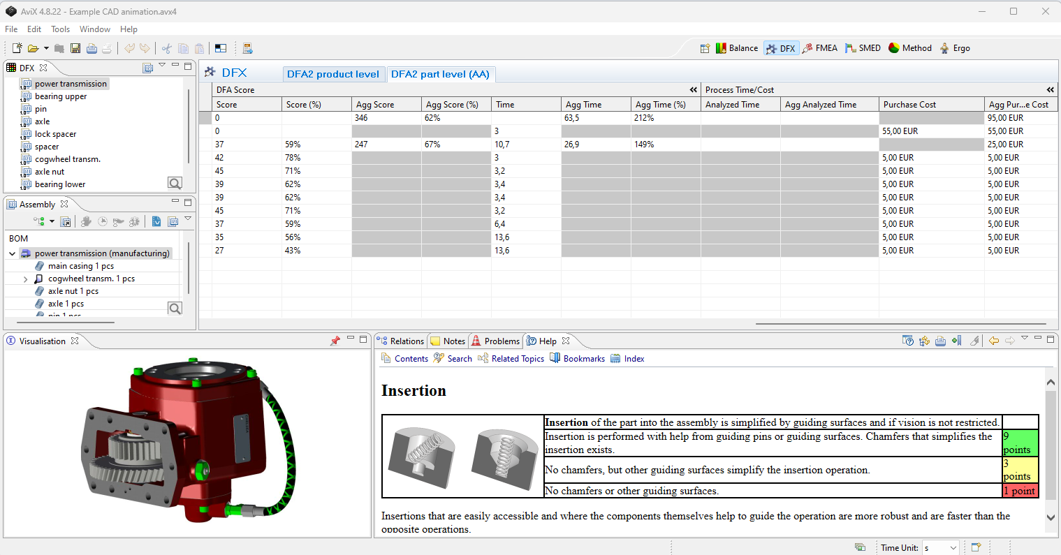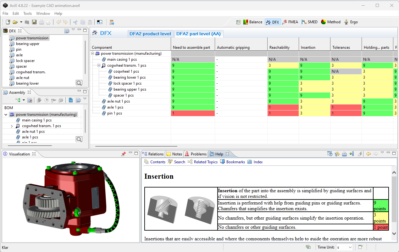 - Help is where the aspect documentation for the different DFX methods are presented, which is very valuable during the analysis phase. (Tip: “Detaching” this view – this making in floating – is preferred by some when analyzing, thus freeing up the available screen space. See the “Performing a DFX analysis” section.