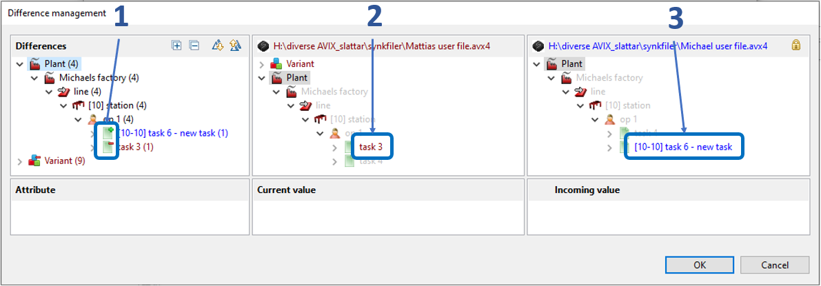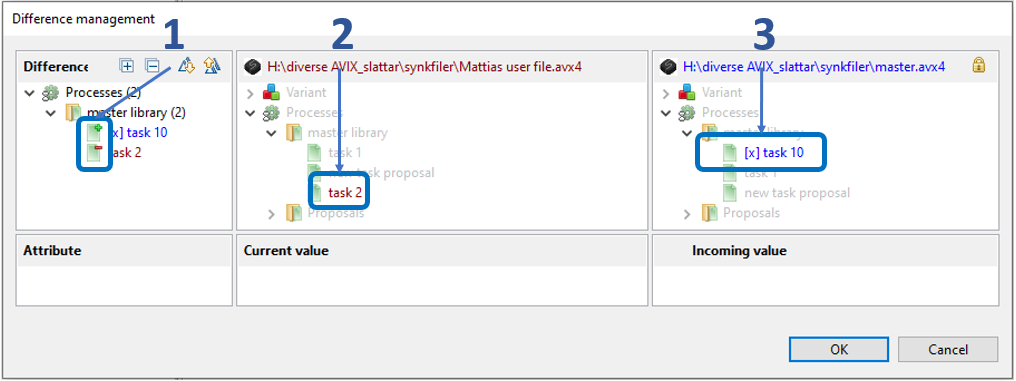 File syncing is done by selecting an AVIX source file to sync from. The master-file can sync from user-files and vice versa to exchange process tasks between the files.
