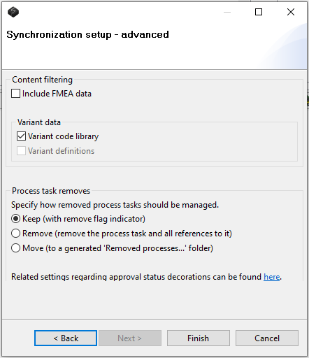 A change management-view lets the user adjust the synchronized data e.g. if a change should be applied or not. In combination with the approval status setting (see APPROVAL SETTING ) this gives a powerful way to keep track of process library changes.