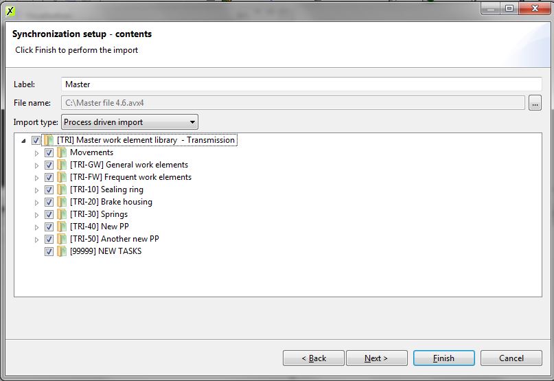 File syncing is done by selecting an AVIX source file to sync from. The master-file can sync from user-files and vice versa to exchange process tasks between the files.