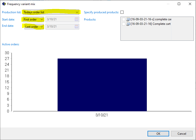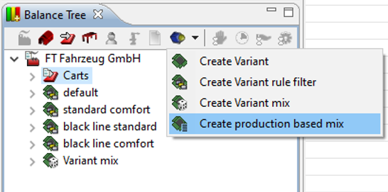 A variant mix is created by selecting the option “Create production based mix” from the Variant menu in the Balance tree view. The line must be selected for the button “Create production based mix” to be accessible. The production based mix appears among the variants.