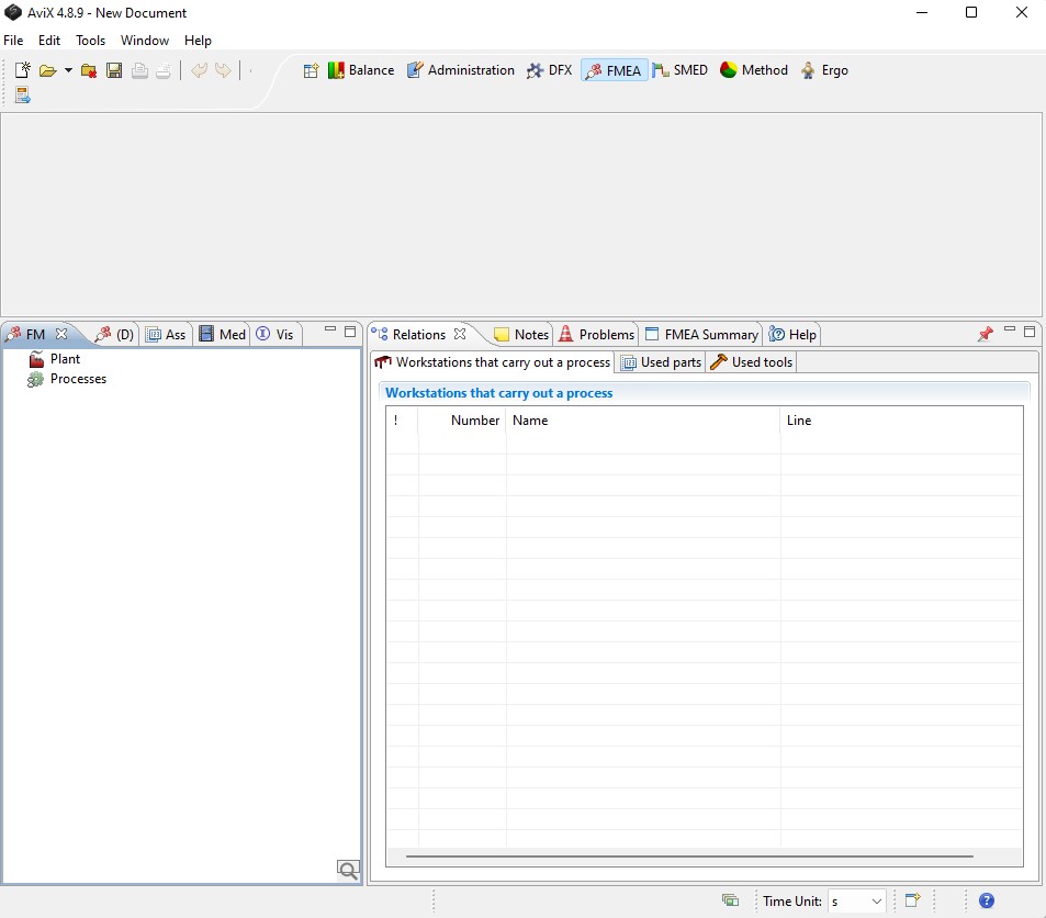 When AVIX is running switch to FMEA perspective (module) through pressing on the FMEA-iconAVIX Guide FMEA_2106_en_html_16148c9c084942c.png in the top center menu. The default layout of AVIX FMEA looks like below. Analogous to other AVIX modules the window layout can be customized, to return to default layout you press.