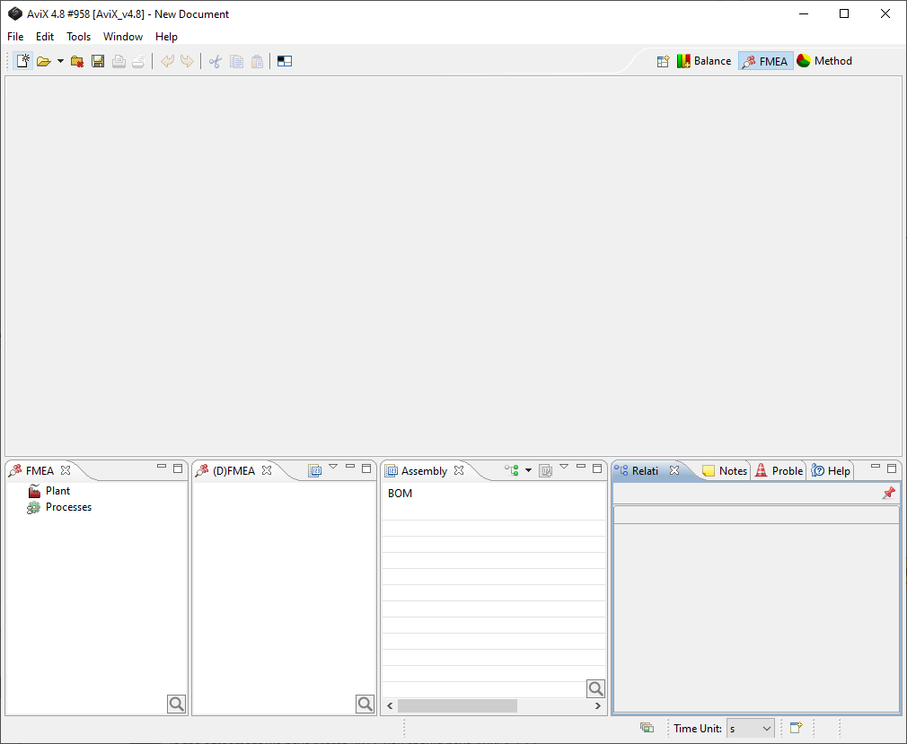 in the top center menu. The default layout of AVIX FMEA looks like below. Analogous to other AVIX modules the window layout can be customized, to return to default layout you press.