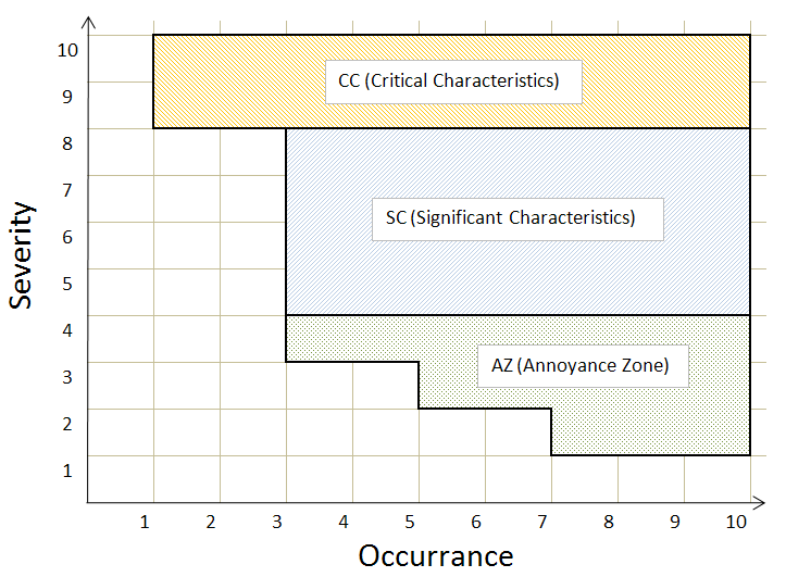 Table 1 The table describes the conditions for Critical Characteristics, Significant Characteristics and Annoyance Zone. Critical Characteristics requires severity 9 or 10, Significant Characteristics requires severity 5 to 8.