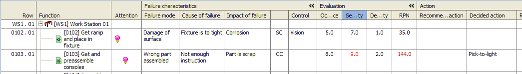 The attention cell is decorated with two warning lights when the FMEA-row requires attention. The prerequisite for attention is that the class is either CC or SC. The left warning light indicates that an action is required; the right warning light indicates that a control is required. The warning lights will disappear when action and control is implemented.