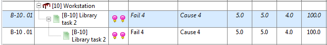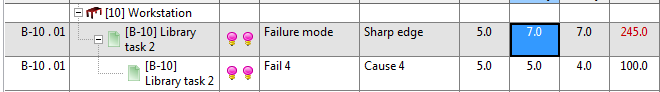 When a task usage is part of the FMEA analysis the evaluation may be done on the corresponding library task or the task usage. In the case a library task has been evaluated in the context of a process plan (Picture 11) that evaluation will be presented also in the FMEA of the workstation (Picture 12).