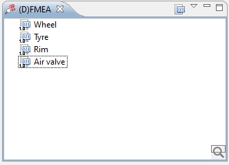 To perform a Design FMEA, first select the FMEA module (perspective) and then the (D)FMEA tab. In the (D)FMEA tab you will see a flat structure of all your parts.