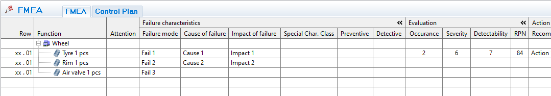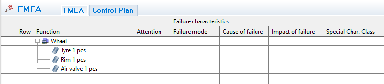 Select the main part in the assembly (Wheel in the example above), and the FMEA-window will be shown.