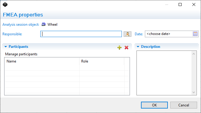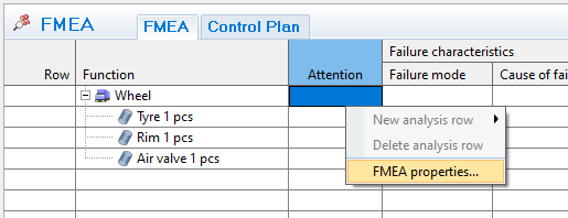 The properties provide basic data such as participants, responsible, date and description about the FMEA. Right-click on a cell in the grid and select FMEA properties to edit the properties.