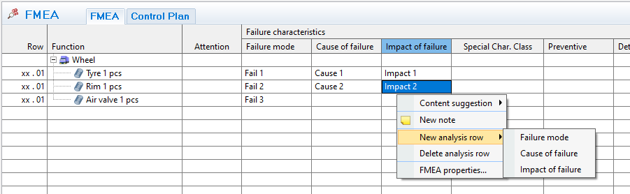 A process in the FMEA may of course have more than one possible failure mode and failure mode may have multiple causes and/or impacts. New rows can be added in the grid to create cells accordingly. Select the row where you want to insert a new row, right-click and select the type of row that is needed (failure mode, cause of failure or impact of failure).