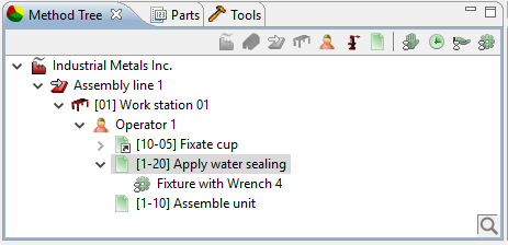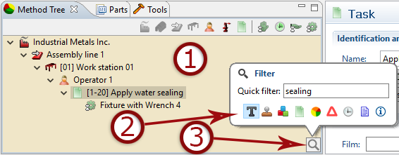 There are filters available for the balance tree, SMED tree, DFX tree, ergo tree, FMEA editor, method tree, parts, tools, and processes.