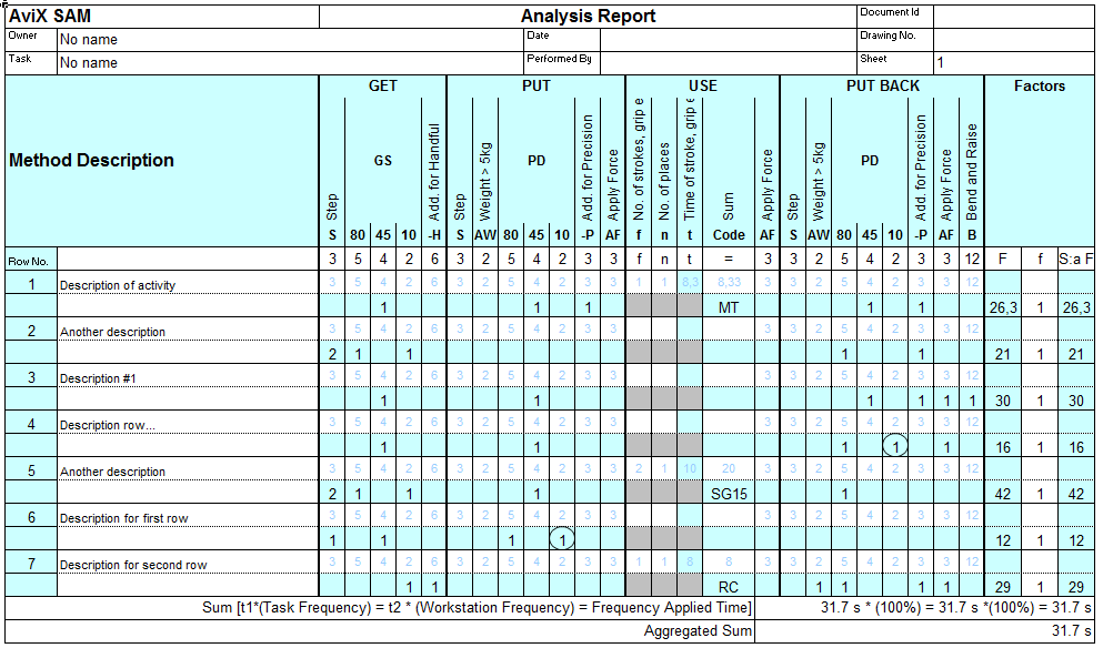 The report will contain one page per Process Task. Apart from the report header, each page contains a label with the activity information, descriptions of each analysis row, the input data set on each row, and summary time analysis information. This report is created to mirror traditional paper-based Sam analysis sheets closely.