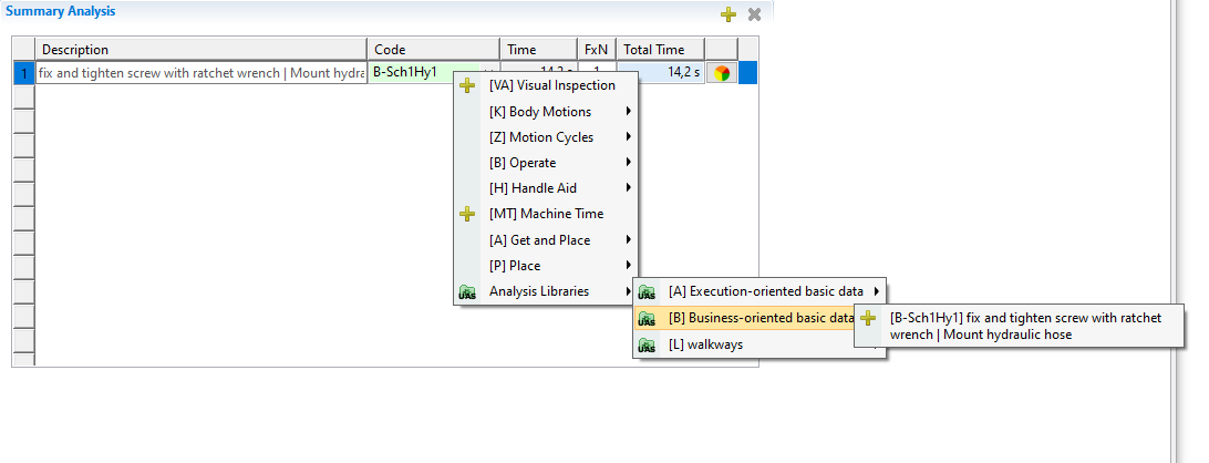 Perform the process analysis, this is done analogous with a summary analysis. However, a Process analysis needs a unique code. The code can be of any format and is used in the summary analysis to include a process analysis. The processes can be organized with folders to divide the process analyses in logical groups (below). The following picture is showing a process analysis and its code, Get material 40 meters away (GM40).