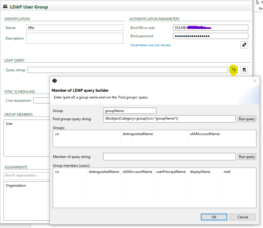 The "LDAP Query" scheduling section is about entering the query string that will eventually be used to get the members from the correct group in the Directory Service. As a convenience, a query builder UI dialog is available (the little button adjacent to the text field).