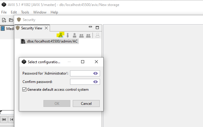 While in "New storage", open the Security view (Help->Open Security). It will be empty, but you should be able to click on the create organization button. Do that, and make sure to set the password for the “Administrator” user. Remember this password, or enter it in your password manager of choice.