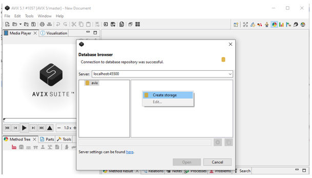 Connect to the running AVIX5 server using "localhost:45500" and create your first storage. Accept the name "New storage", and open the storage.