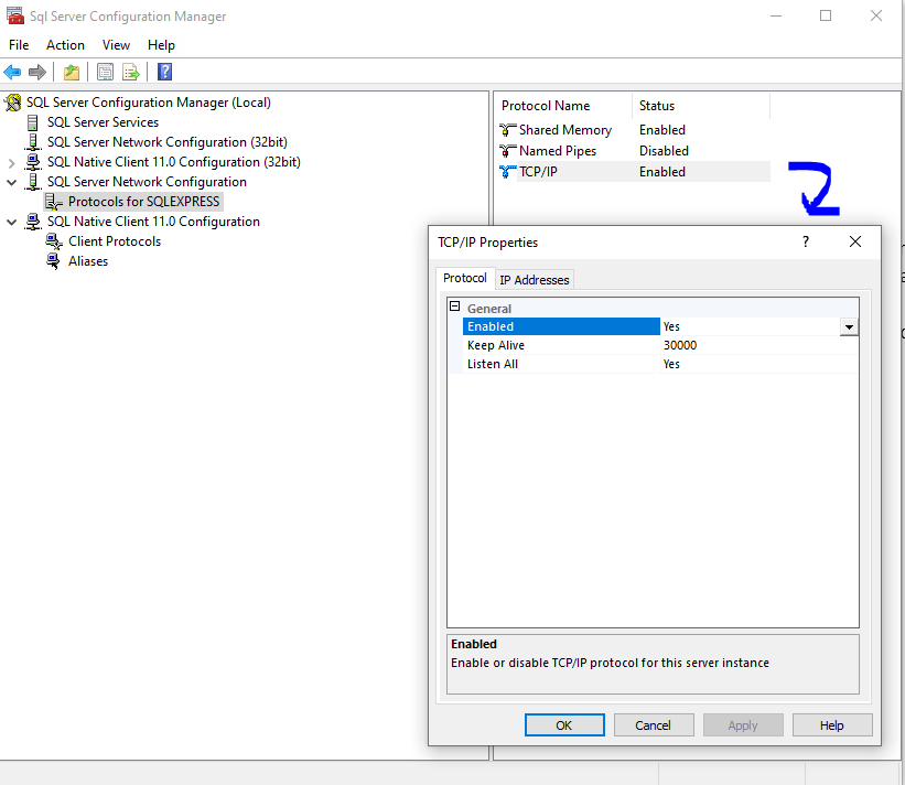 - Go to "Protocols for SQLEXPRESS"