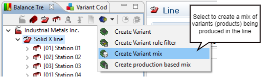 A variant mix is created by selecting the option “Create Variant mix” from the Variant menu in the Balance tree view. The line must be selected for the button “Create Variant mix” to be accessible.