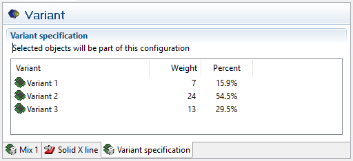 The variant mix appears among the variants. In the specification of the variant mix the weight for each variant is set. The weight is entered as an integer in the column for weight and AVIX will then calculate the relative weight expressed in percentages (see picture below).