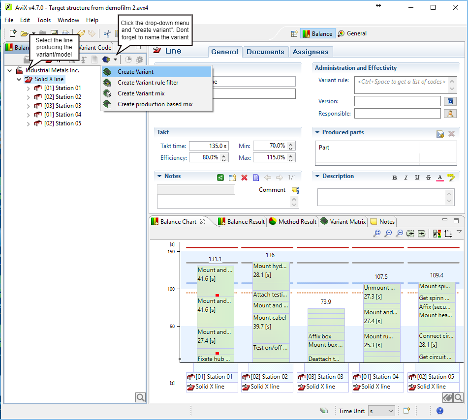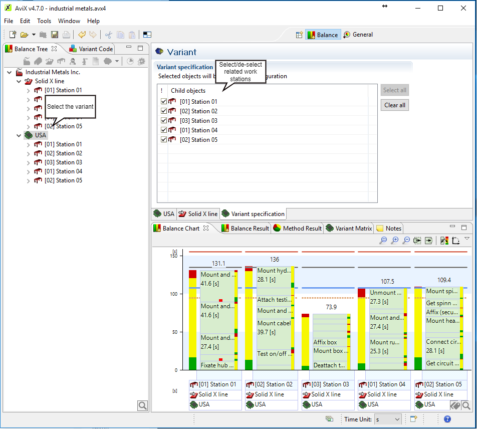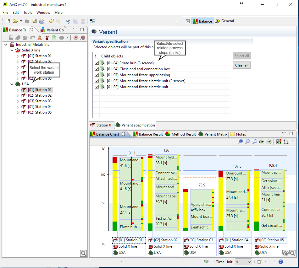 Depending on the variant, the number of workstations and tasks will vary. This is handled by selecting or deselecting stations/tasks that are not used for that specific variant. The selection/de-selection can be done at workstation level or task level.