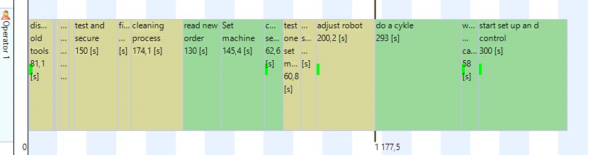 View the movie of each task and decide whether it is an inner or outer task. If the task can be performed when the machine is running it is an outer task, otherwise the task should be classified as an inner task. The SMED-type (inner or outer) is set by right clicking on a task in the graph and the SMED type is set in the submenu that appears. The task will change colour when you set the SMED-type. Inner tasks are light-brown and outer tasks are green. If the line is selected the SMED-graph should resemble the picture below.